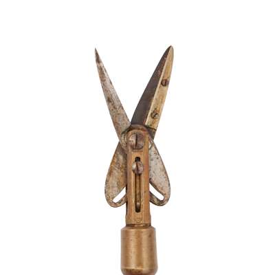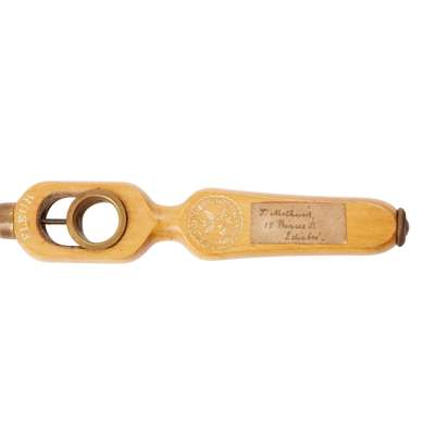 bamboo cane with finger pull in the ash handle that allows the shears to the end to snip, the handle also with a small concealed pollination brush and gilt-stamped 'Fleur' and 'Fruit' verso with a brass cap to the end, the cane and handle with ink inscription 'T. Methven, 15 Princes St, Edinburgh'