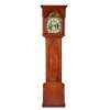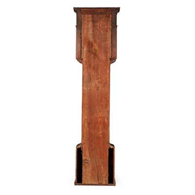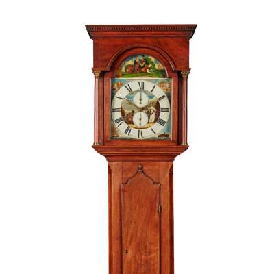 the cream-painted break arch dial with black Roman numerals and subsidiary second and date dials, the arch with a scene of the Union of Scotland and England, the spandrels painted with Naval scenes, signed 'J. Sharpe, Stamfordham', the mahogany case with flat top with moulded dentine frieze above an arched door flanked by a pair of gilt metal mounted columns, the trunk with a Gothic arched door and boxwood inlaid chamfered corners, on a moulded square plinth base, the twin train brass movement striking to a bell