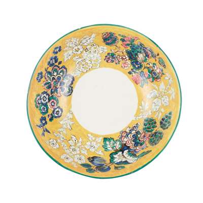 painted with various flowers and foliage on a mottled yellow ground, impressed WEMYSS
