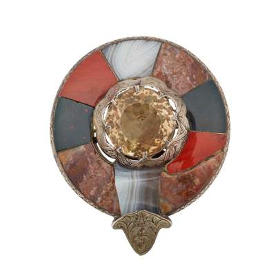 of circular outline, claw set to the centre with a Cairngorm citrine, surrounded by various hardstones including, bloodstone, Montrose agate, in a stylised border