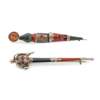 modelled as a basket-hilted sword, set with chalcedony and bloodstone, with ball finials; together with another kilt pin, modelled as a dirk, with pastes set to the terminal and the bi-knife and fork