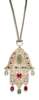 of oversized-scroll pierced palm form, collet set to the centre with a large oval cut emerald cabochon, set throughout with graduated trap cut emeralds, circular and cushion cut rubies and synthetic rubies, fringed by similarly set drops, the whole suspended from a long interwoven gold thread, of adjustable length
