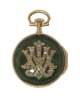 the dark green guilloche enamel back with applied monogram, white enamel dial with gilt detail, blue Roman numerals, gilt hands, and signed, keyless wind lever movement, numbered to the cuvette, 99302 and also to the movement