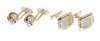 both marked 750, to comprise one pair with interwoven white and yellow gold know with simple T bar fitting; the other of square outline with textured white gold border and central panel, with T bar fitting and simulated bamboo bar (4)