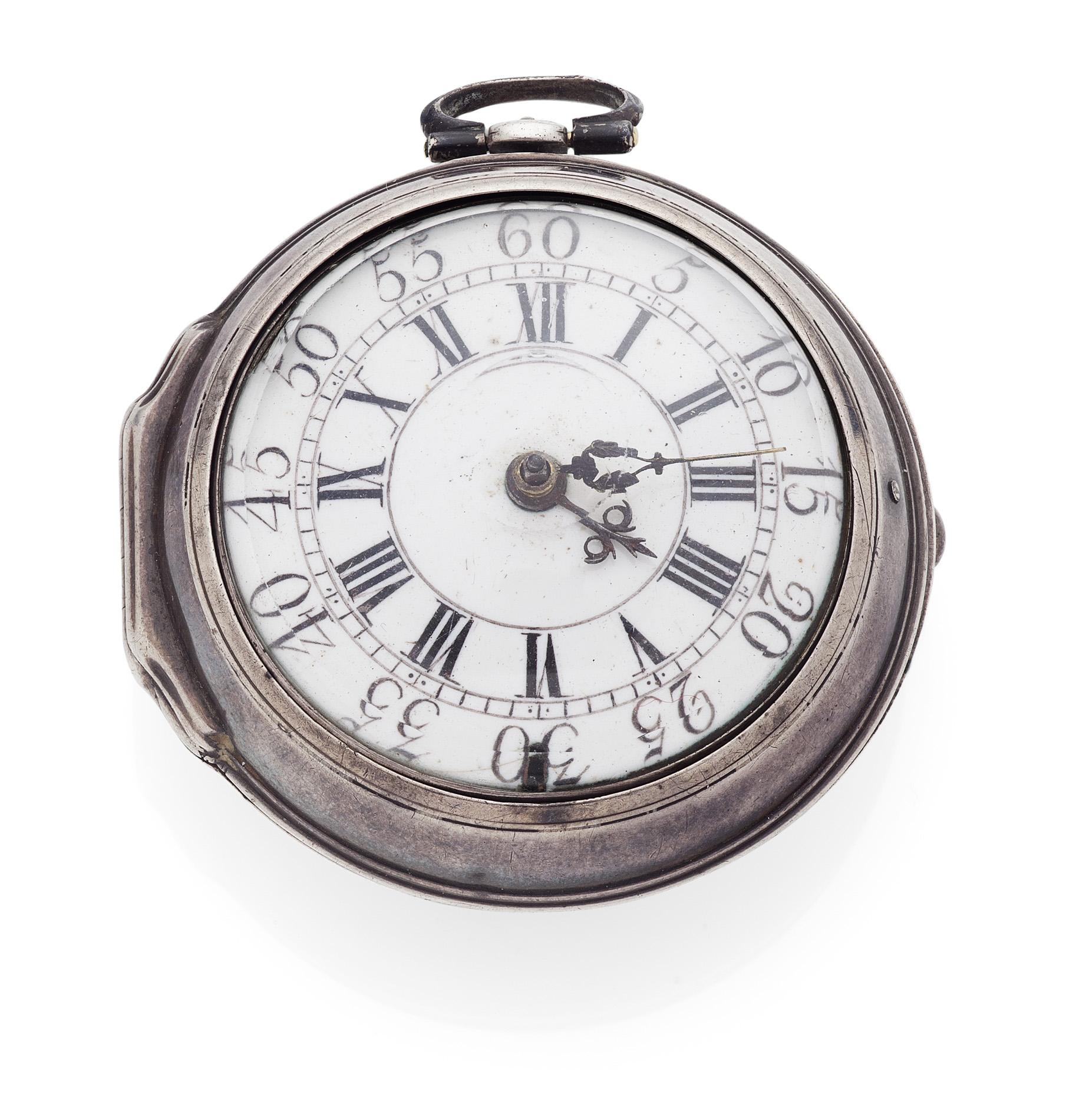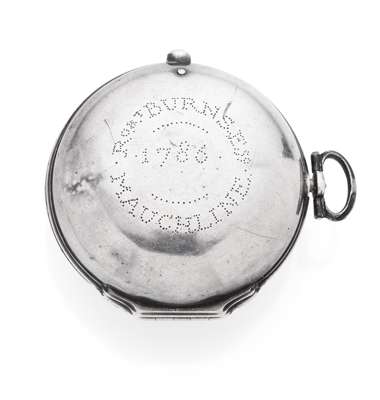 the plain outer case unmarked, containing cut paper insert with bird and heart motifs and initials in ink, the rear cover faintly pricked RobT Burns Mauchline 1786', J Josephson, London and numbered 2512, verge movement, cased marked for London circa 1780, date letter indistinct, the enamel dial with outer Arabic and inner Roman numerals, ornate blued hands