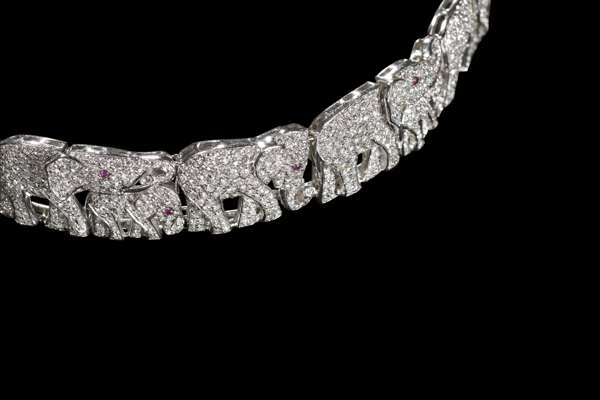 formed as six links of elephants and calfs on parade, all pave set with diamonds and ruby eyes