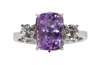 claw set with a rectangular cushion cut pink sapphire, flanked to either side by a round cut diamond, to a plain 18ct white gold shank