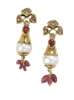 each of tapering design, composed of a cluster of three simple rose cut diamonds, surmounting a collet set circular rose cut diamond and similarly set ruby cabochon, on a conical capped faceted cultured pearl, fringed by a cluster of oval polished ruby pebbles, with post and butterfly fittings