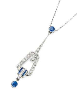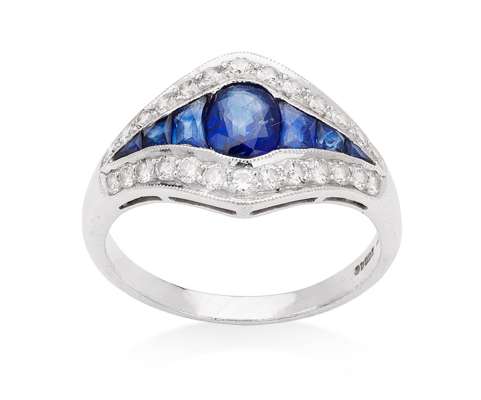 An Art Deco style 18ct white gold mounted sapphire and diamond set ring