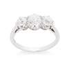 claw set to the centre with a old European cut diamond, flanked to either side by a smaller old European cut diamond, to a plain 18ct white gold shank