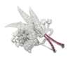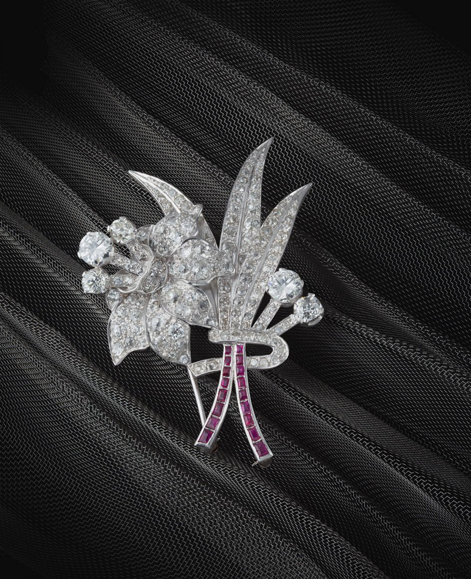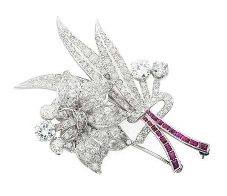 of stylized flower-head and floral design, claw set throughout with graduated round brilliant and old brilliant cut diamonds, with graduated rectangular cut ruby set stems and hinged double-pin fastening to reverse