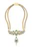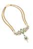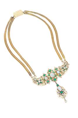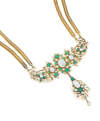 the central articulated panel collet set with graduated oval opals, each in a surround of old cut diamonds and emeralds set in yellow metal with pierced scrolling detail, the central cluster suspending a detachable pierced and scrolling panel similarly set with opals, diamonds and emeralds, to a double yellow metal woven link chain, the box clasp with engraved floral detail