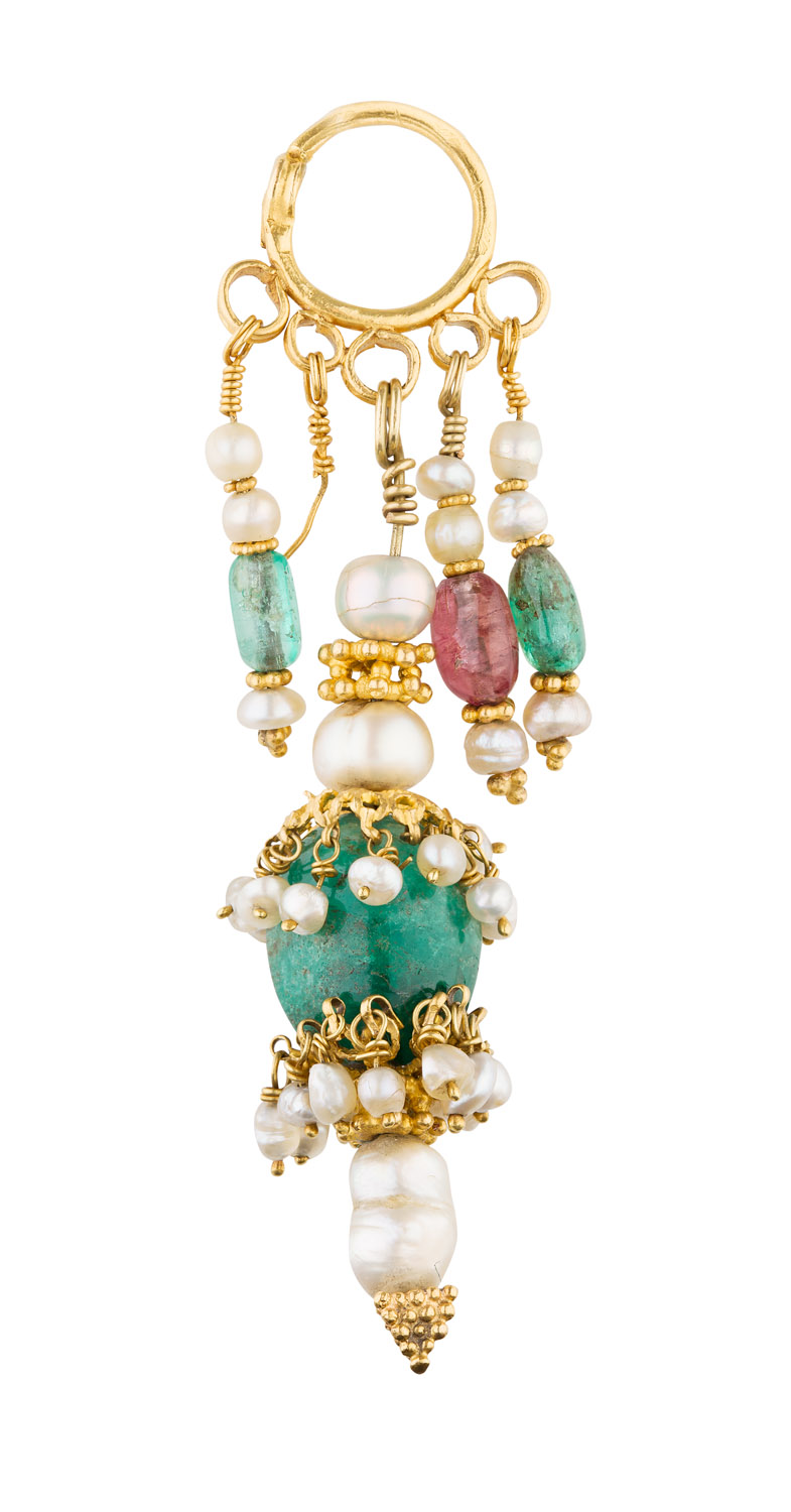 the large yellow metal loop suspending four small pearl, emerald and ruby set drops (one deficient), each with textured yellow metal spacers, the large central drop composed of three baroque pearls with beaded yellow metal spacers, and a large emerald bead with yellow metal wirework mounts with seed pearl fringed detail, with french control marks to suspension loop