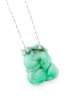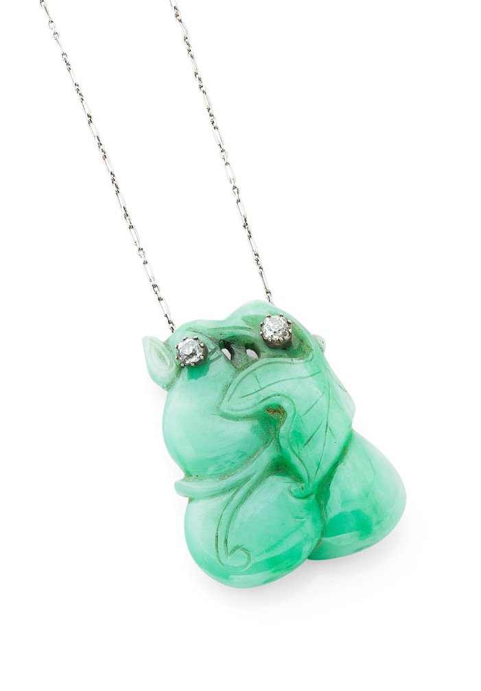 the central double gourd and foliate carved jadeite pendant off-set by two circular cup and claw mounted old mine cut diamonds, the whole suspended from a fine white metal chain, with cylindrical clasp, also set with borders of rose cut diamonds
