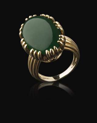 claw set with a large oval cut deep green jade cabochon, to a fluted setting and tapering fluted shank, stamped VC&A 1380 SO