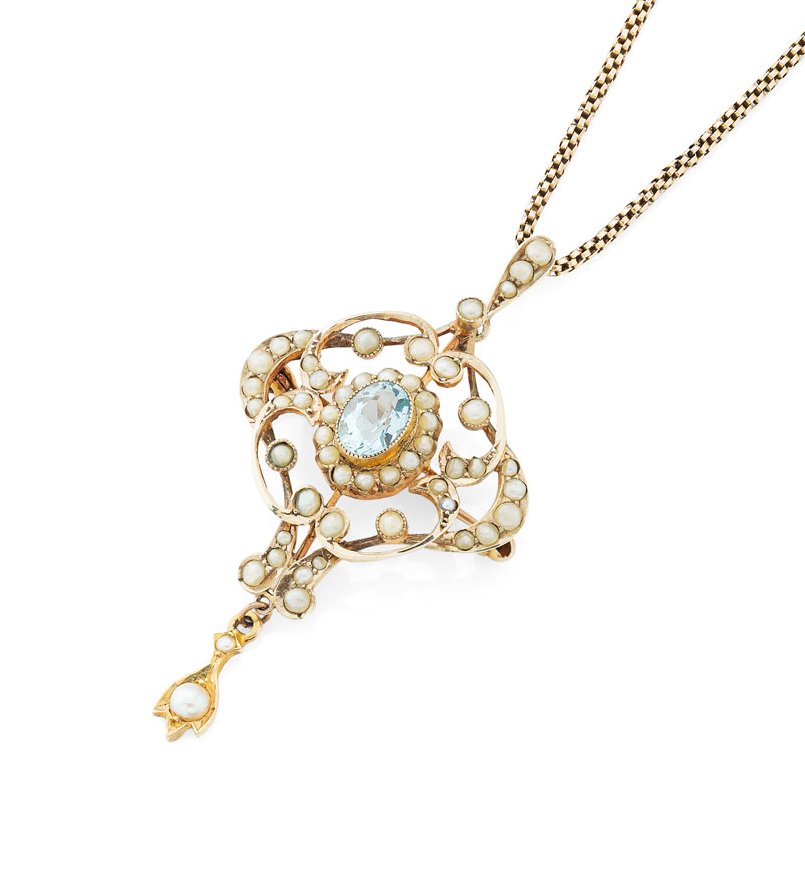 modelled in yellow metal stamped 9ct, of open scrolling form, set to the center with a oval cut aquamarine and throughout with small seed pearls, to a yellow metal woven link chain