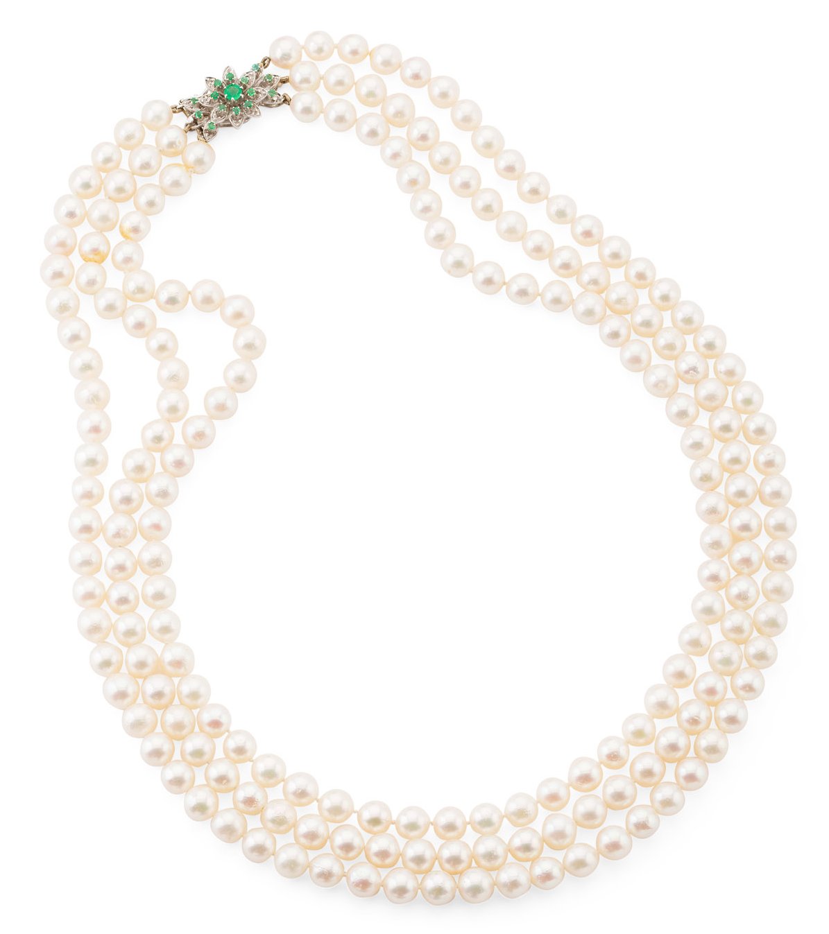 composed of three graduated strands of uniform pearls, to a white metal clasp of floral design set throughout with graduated round cut emeralds, clasp indistinctly marked