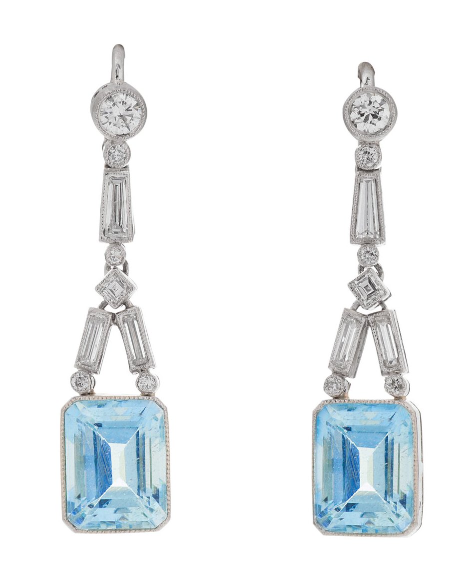 each millegrain set with a small round cut diamond, suspending a drop composed of similarly set small round, square and baguette cut diamonds, terminating with a rectangular step cut aquamarine