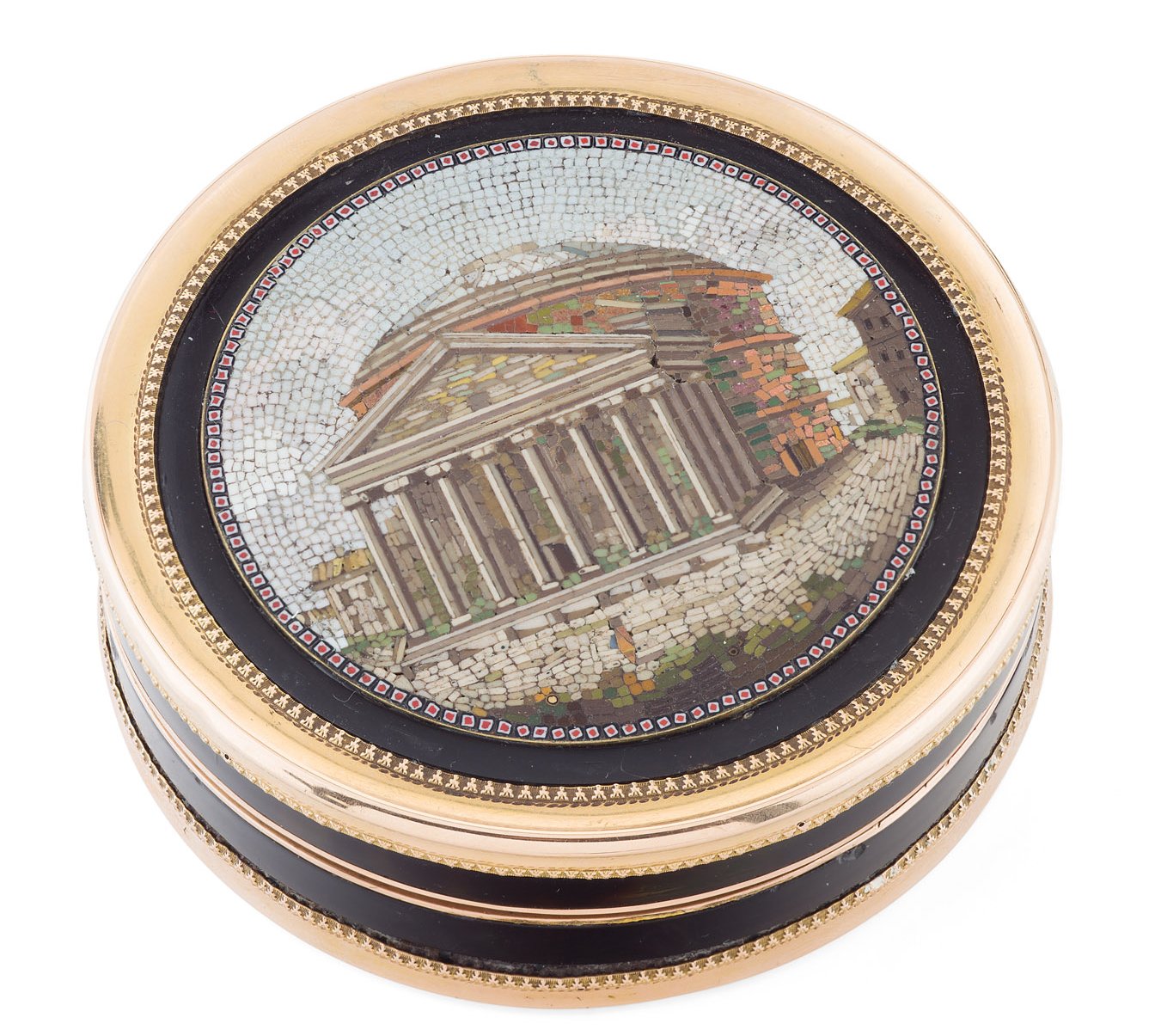 of circular form, tortoiseshell body, gold mounts with central vignette of The Pantheon, beaded detail to the gold borders