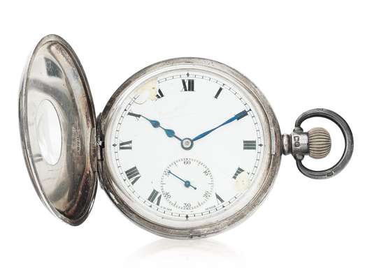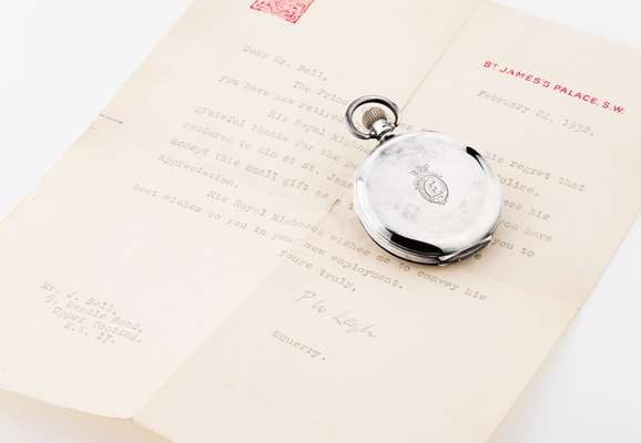 the silver demi-hunter cased, keyless wind pocket watch with black enamel outer hours indicator, enamel dial, subsidiary seconds dial (a/f), the outer hinged cover with the Princes crest, motto and feathers, the lever movement signed Tavannes Watch Co. the silver case marked for Dennison, Birmingham 1928. The letter, unaddressed but in POW envelope, on St James's Palace note paper to Mr Bell referring to his retirement from the police and enclosing the watch as a personal gift, the letter from an equerry P W Leigh and dated February 2th 1932
