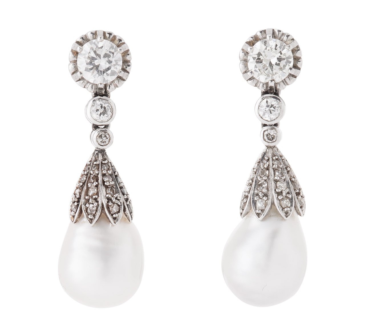 each composed of three graduated round brilliant and single cut diamonds, suspending a single cut diamond capped baroque cultured pearl drop, with screw-turned post and disc fittings