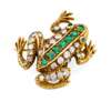 modelled as a frog in unmarked yellow metal, set throughout with round cut diamonds and emeralds, with safety pin fittings to reverse