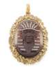the hardstone cameo depicting the head of a Pharaoh, the headpiece with applied white metal diamond set details, the yellow metal border of scrolling design with black enamel hieroglyphs, the suspension loop of similar design