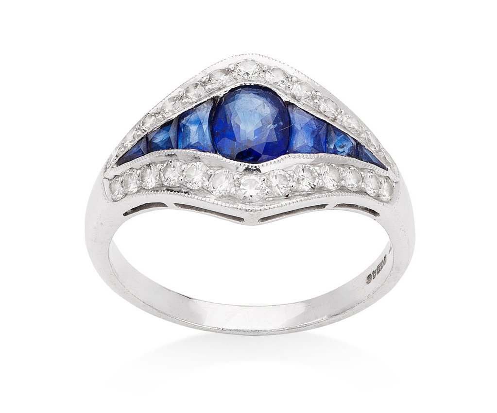 the lozenge shaped front invisibly set to the centre with an oval cut sapphire flanked to either side by graduated French cut sapphires, within outer borders, millegrain set with slightly graduated round brilliant cut diamonds
