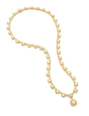 composed of graduated yellow metal links each set with a cushion cut fancy yellow diamond in an open border of small round cut diamonds, alternated with small floral clusters each set with seven small round cut diamonds, the central link suspending a diamond set pendant claw set with a cushion cut yellow diamond and an open double border of small round cut diamonds, with a concealed clasp, stamped 750