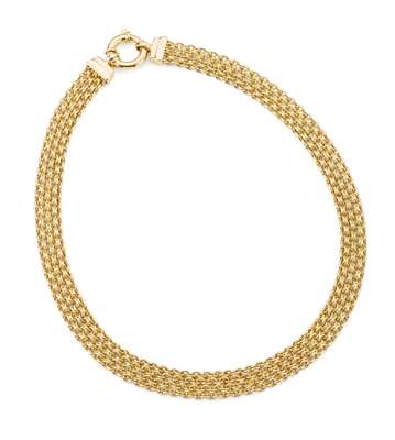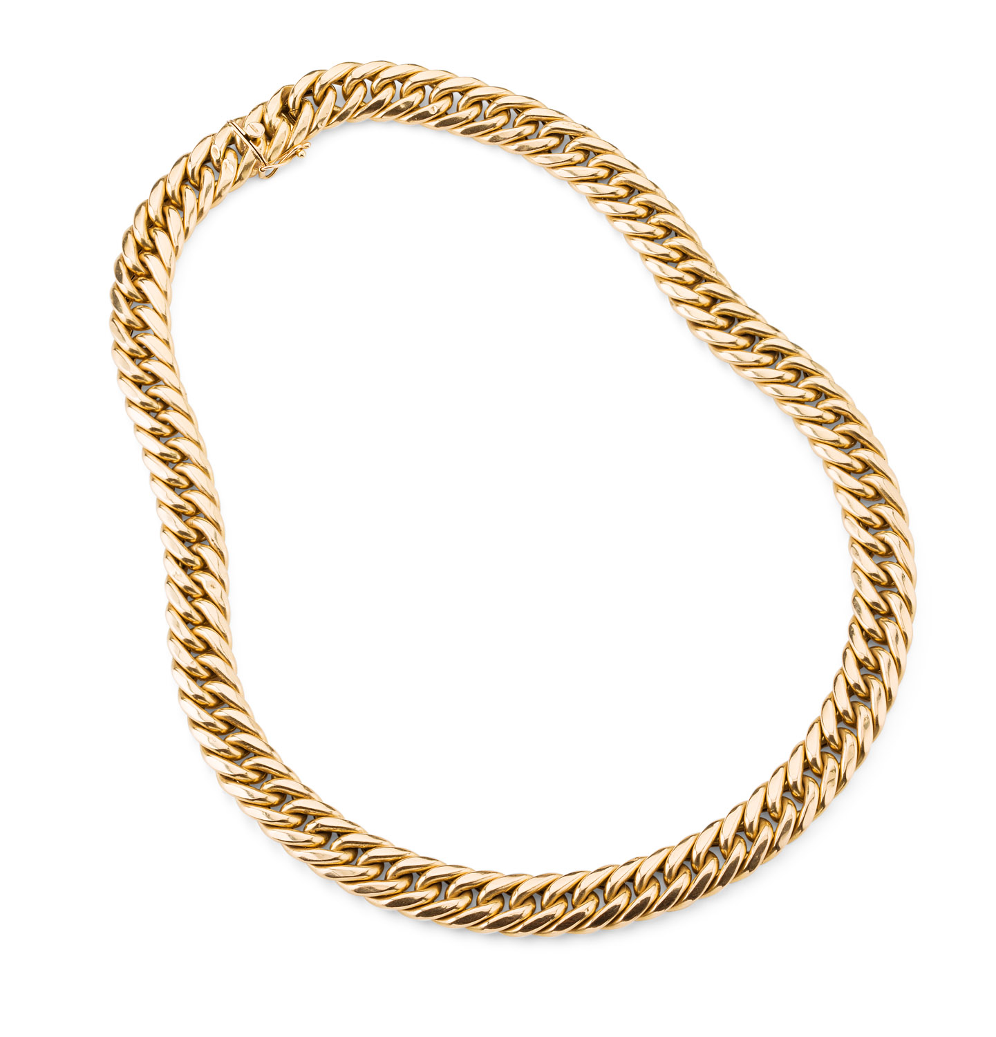 one of tight red coloured curb links, stamped 750, snap clasp with safety clip, the other of broad form with tight textured links, stamped 750 and Marotto (2)