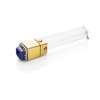 French control marks, signed Boucheron Paris, of tapering form, the yellow metal hinged mount set to the lid with a square lapis lazuli cabochon in a single border of small rose cut diamonds, small half seed pearl thumb piece, to a tapering crystal scent bottle