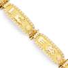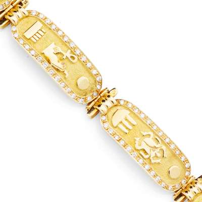 composed of five curved oval links, each depicting hieroglyphics, to a matt-textured ground, within an outer border of round brilliant cut diamonds, with concealed box clasp and additional safety clip