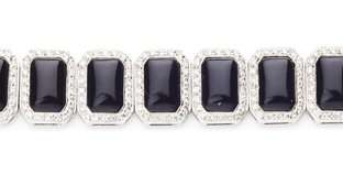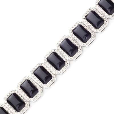 composed of seventeen rectangular clusters, each collet set with a rectangular onyx cabochon in a single border of small round cut diamonds, set in white metal with a concealed clasp, stamped 750