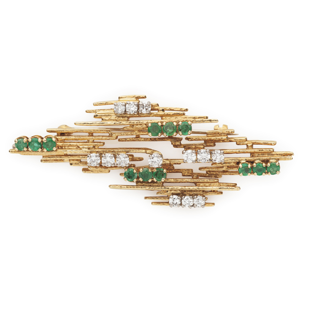 A 1970's Modernist 18ct gold mounted emerald and diamond set brooch