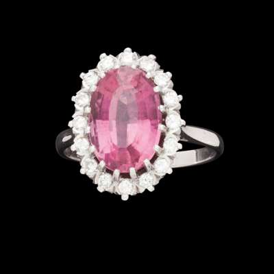 claw set with an oval mixed cut pink tourmaline, in a single border of claw set round cut diamonds, to a plain white metal shank stamped 18ct