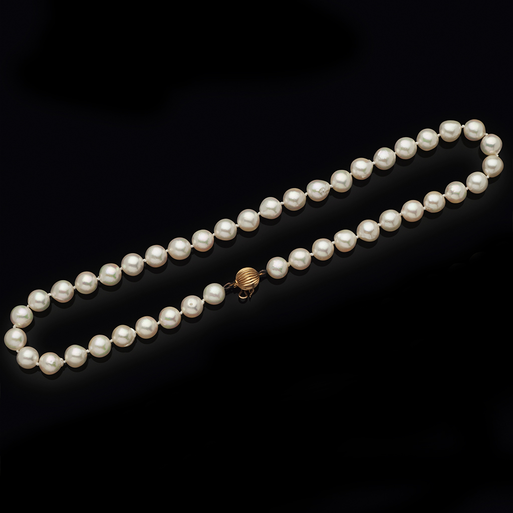 composed of uniform-sized off-round pearls, with melon-ball form clasp, with additional detacheable S-scroll drop, clasp stamped JKa 375, contained in a tooled maroon leather box