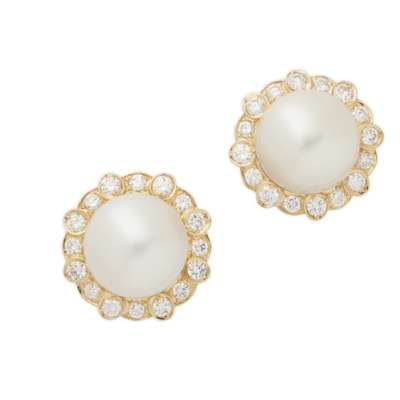 each with central cultured South Sea pearl, measuring approximately 17.4mm diameter, within a shaped circular border, grain set with sixteen graduated round brilliant cut diamonds, with hinged clip fittings, stamped 14K, contained in a tooled blue leather fitted case, stamped Colingwood of Conduit St...
