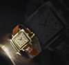 An 18ct gold cased gentleman's wrist watch, circa 1990, Ref. No. 1876 automatic movement, stepped square case and bezel, gilt indicators, 12 and 6 Arabic numerals, sweep second hand, date aperture, champagne dial, case numbered, 2481116, leather strap, gilt buckle, in an IWC box, booklets and purchased 1998
