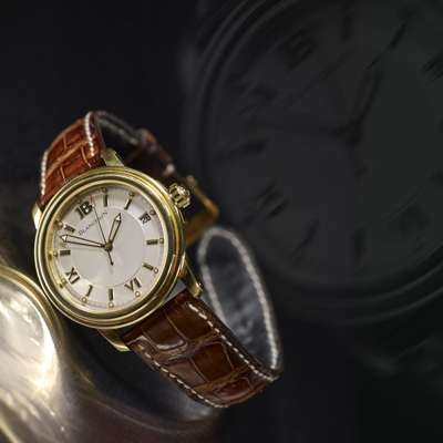 A gentleman's 18ct gold cased wrist watch, automatic, stepped bezel, silvered dial, applied gilt batons, 'B' at 12, date at 3, sweep second hand, skeleton hands, case no. 113., screw down winder, leather strap, gold buckle, in box, various booklets, purchased 1995