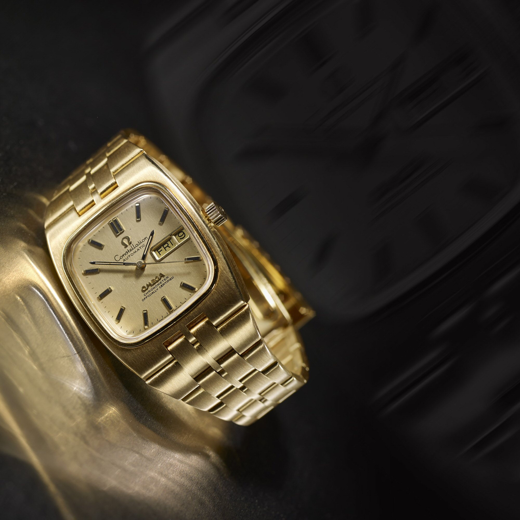 Circa 1970s, 18ct yellow gold case, of rounded square form, automatic movement, champagne dial, inscribed, baton numerals, sweep second hand, day and date at 3, brushed bezel and gold bracelet, Omega foldover clasp, bought 1994
