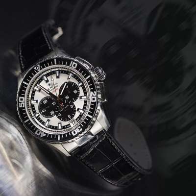 Automatic movement, stainless steel case, white index dial black detail, luminous hour indicators and hands, date at 6, sapphire glass, water resistant, black rotating bezel, Case No.148342, Ref. No. 03.2062.405, No. 008/500, leather strap, fold over clasp, with a soft zipped Zenith case Limited Edition Watch