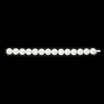 composed of fourteen circular clusters, each set in white metal with a central cluster of seven small round cut diamonds in a double border of tapered baguette and round cut diamonds, with a concealed clasp stamped 750 0982