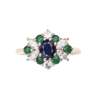 designed as a shaped oval cluster, the central claw set oval cut sapphire, within a border similarly set with six circular cut emeralds, four marquise and two round brilliant cut diamonds, shank stamped 18ct
