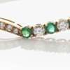 of hinged design, scrolling front, central border, alternately claw set with circular cut emeralds and round brilliant cut diamonds, flanked to either shoulder by scroll bar set slightly graduated round brilliant cut diamonds, concealed snap fastening
