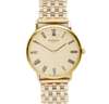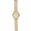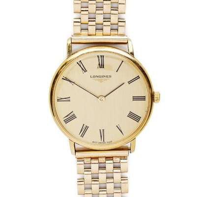 the circular champagne dial, with Roman numerals, plain bezel, associated flexible polished link bracelet, fold over clasp with engine turned decoration