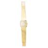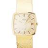the rounded square champagne dial with baton numerals, date aperture, and inscribed De Ville, integral textured flexible bracelet, fold over clasp
