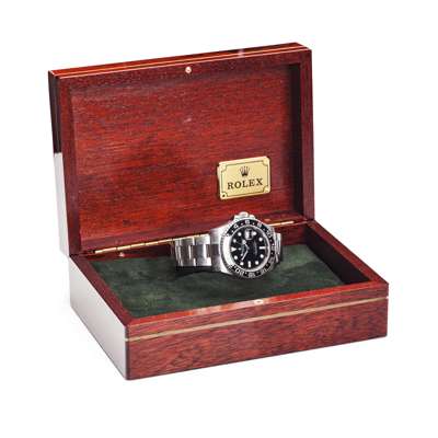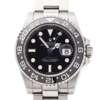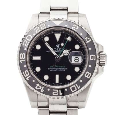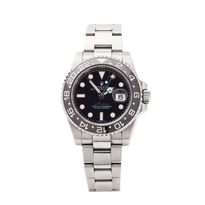 GMT - MASTER II, rotating black 24 hour bezel, black dial, white indicators, green second hour hand, green lettering, screw down crown, stainless steel Oyster bracelet, in rolex hardwood box, wallet, card etc. Ref. 116710LN