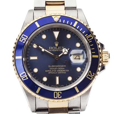 in stainless steel and gold case, blue rotating bezel, blue dial, white dot indicators, sweep second hand, gold screw down crown, gold and stainless steel Oyster bracelet, deployant clasp, Ref. 16613, Circa 1995, with Rolex box, papers, cards, cardboard box, spare links, serial no. 16803 8910192
