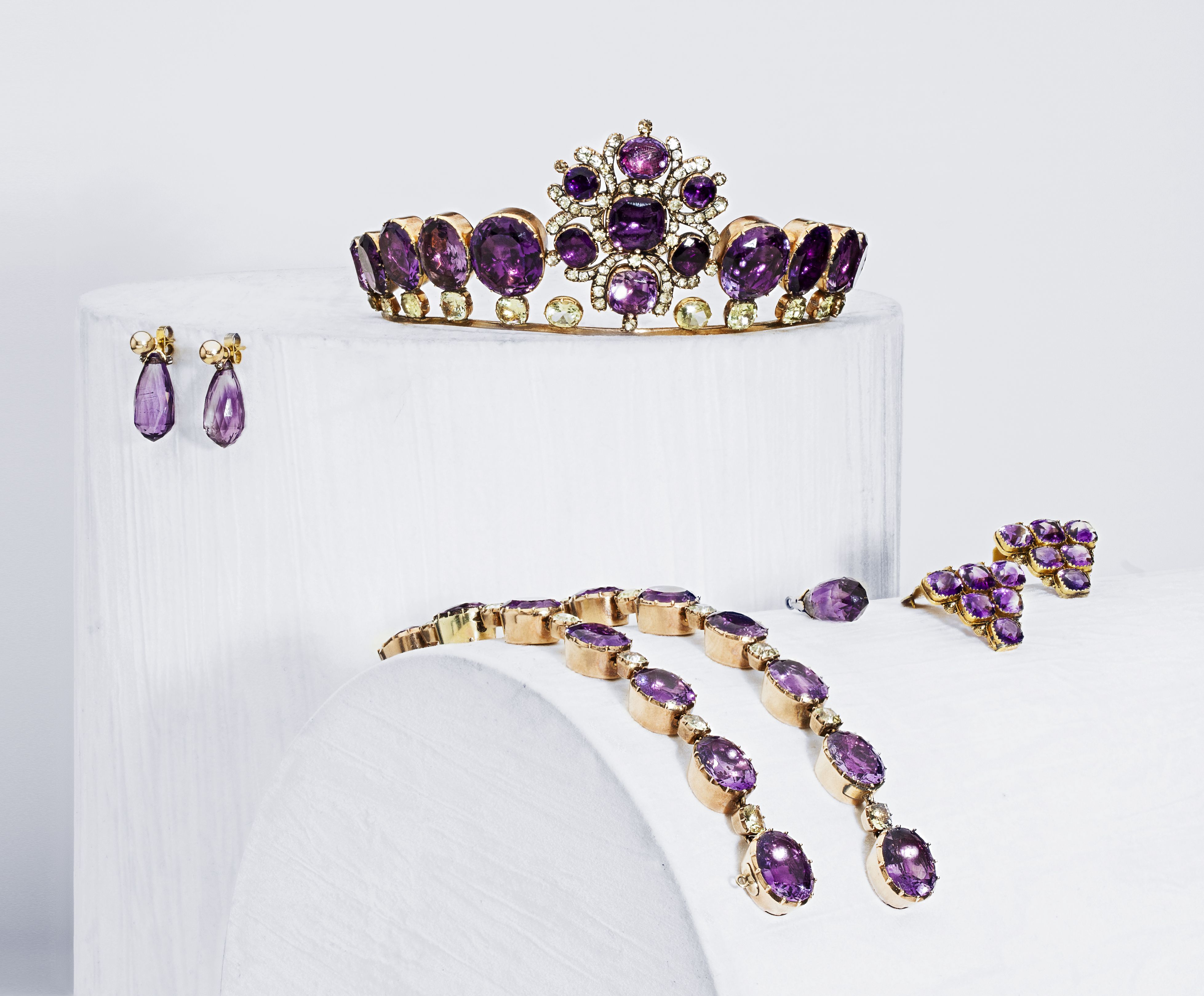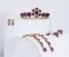 comprising a tiara set with graduated oval cut amethysts, paste and chrysoberyl, the central cluster motif detaches to become a brooch; two matching bracelets with concealed clasp; a pair of pendant earrings set with briolette cut amethysts and a matching pendant; and two associated amethyst clips; in a fitted blue velvet case