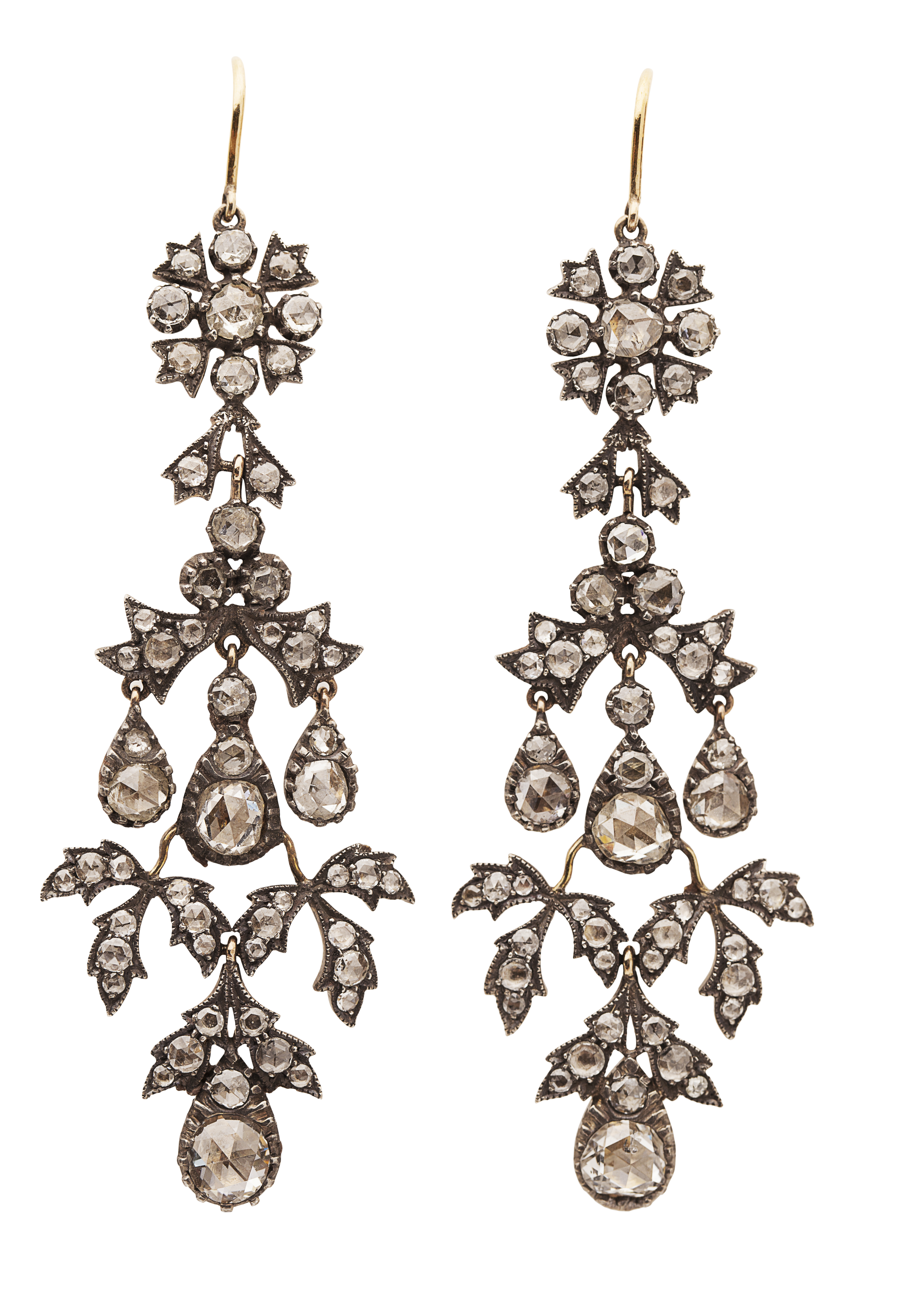 the floral cluster suspending a tapering articulated drop with further secondary drops, set throughout with graduated rose cut diamonds, hook fittings